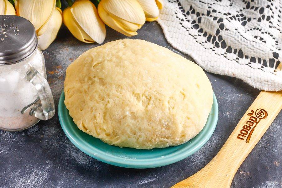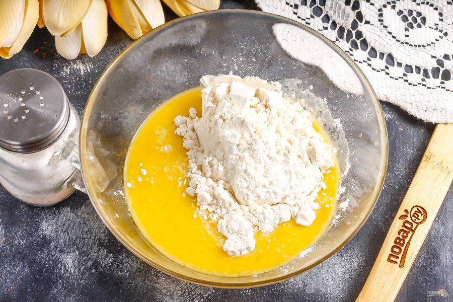 Всыпьте разрыхлитель и пшеничную муку, замесите плотное, но не слишком тугое тесто.