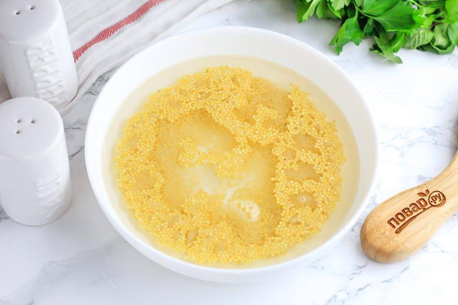 Промойте пшено в холодной воде несколько раз, пока она не станет прозрачной.