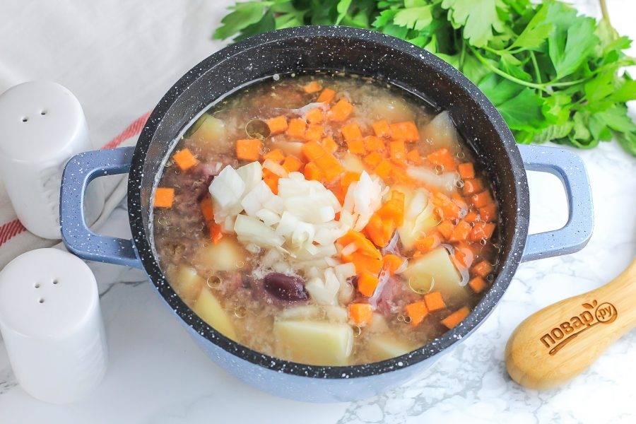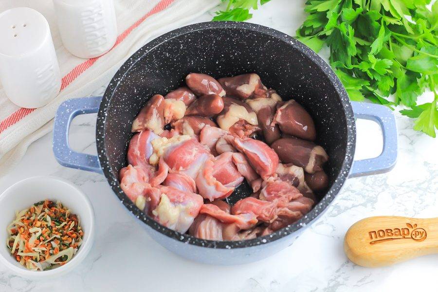 Дольше всего готовятся желудки и сердечки — примерно 1 час. Поэтому добавьте их в казан или кастрюлю и залейте кипятком. Отварите в течение 1 часа, удалив образовавшуюся пену.