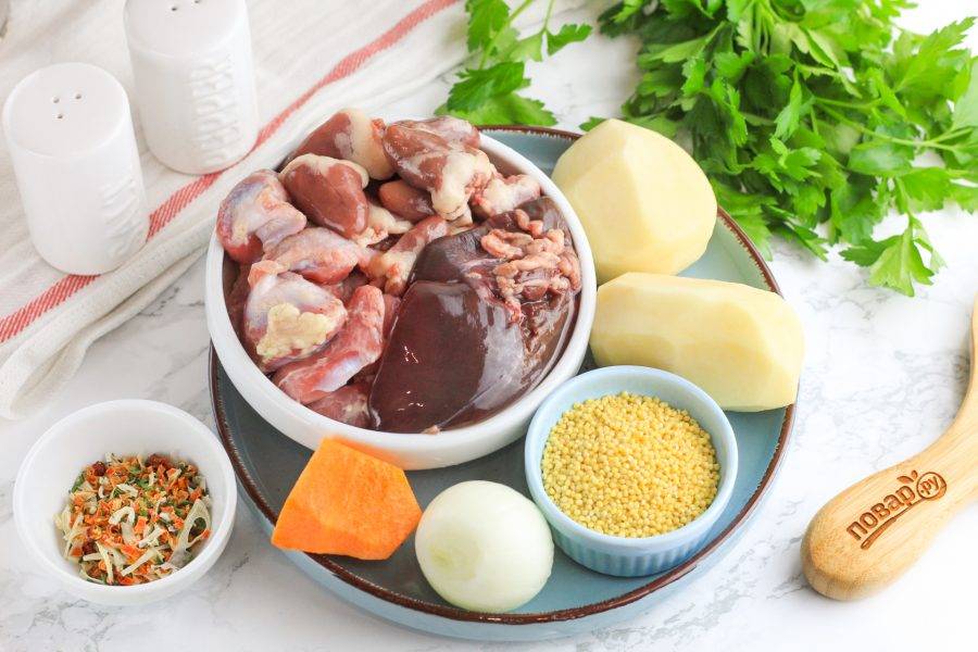 Подготовьте указанные ингредиенты. Лук, морковь и картофель очистите от кожуры и промойте в воде. Желудки очистите и промойте вместе с печенкой и сердечками.