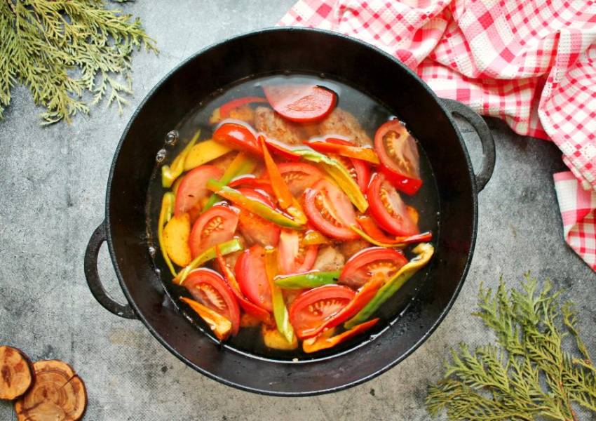 У болгарского перца удалите плодоножку, семена и порежьте крупными полосками, выложите в казан. Залейте все водой так, чтобы она полностью покрывала продукты, посолите и поперчите.