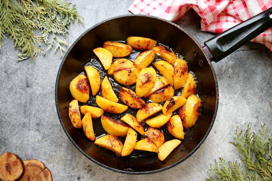 Картофель разрежьте вдоль на 6-8 долек, соедините с томатной пастой, посолите и перемешайте. Выложите в сковороду после обжаривания котлеток. Жарьте картошку на среднем огне до золотистой корочки. Она должна обжариться, но остаться полусырой.