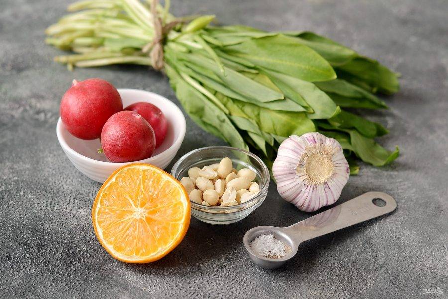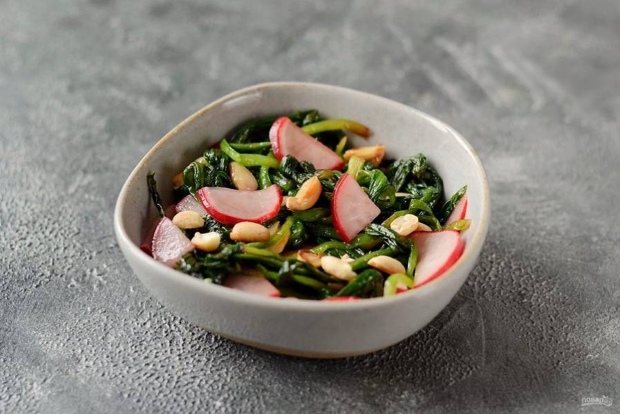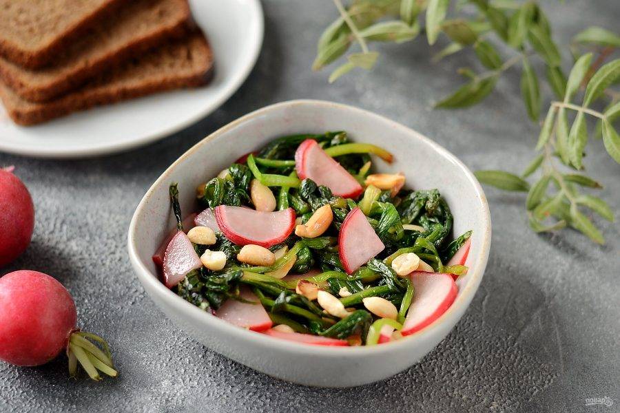 Соедените черемшу, редис и арахис. Посолите и поперчите по вкусу.