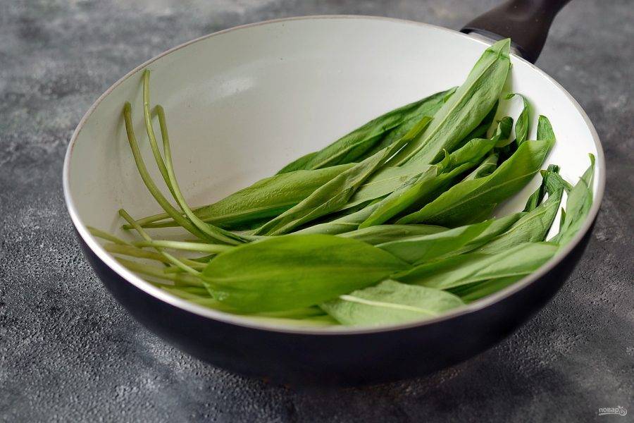 Черемшу тщательно промойте, обсушите. Обжарьте в чесночном масле до мягкости.