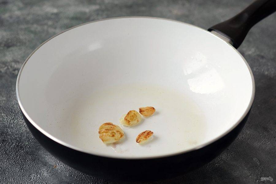 Разогрейте сковороду с растительным маслом. Добавьте пару зубчиков чеснока, жарьте 30 секунд до коричневого цвета. Затем уберите чеснок.
