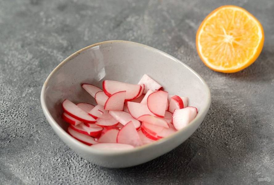 Редис помойте, обсушите, нарежьте кружочками. Сбрызните лимонным соком, отложите в сторону.