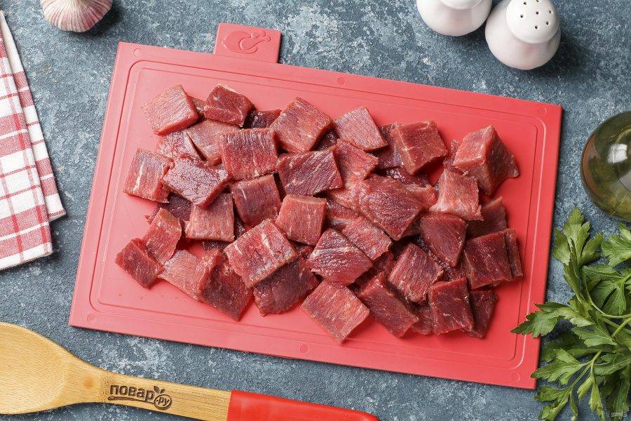 Мясо промойте, обсушите и если необходимо, очистите от плёнок. Затем тонко нарежьте поперёк небольшими кусочками.