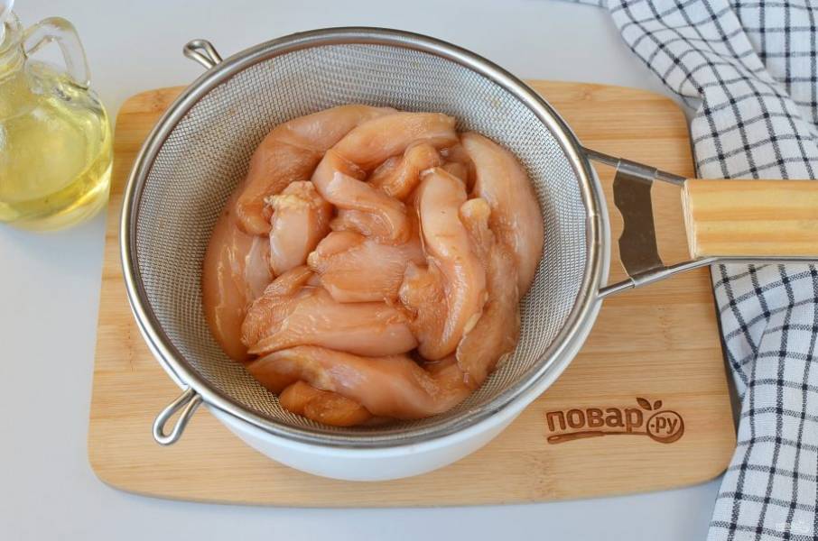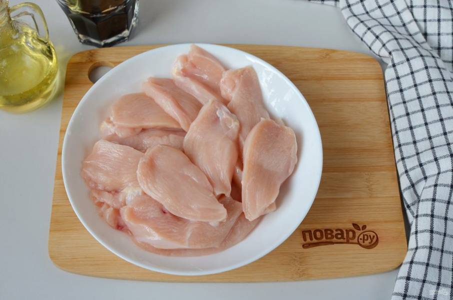 Порежьте небольшими кусочками поперек волокон, толщина 6-7 мм.