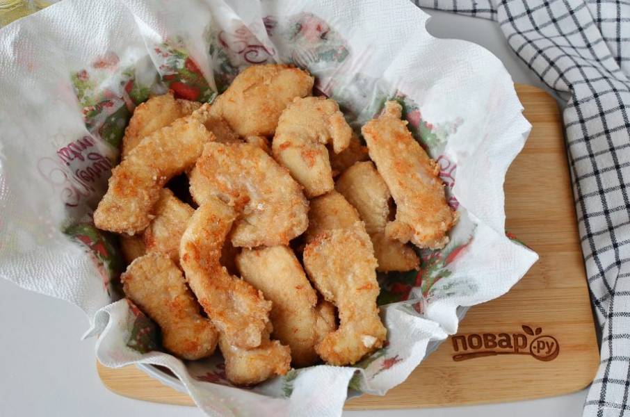 Поставьте сковороду с маслом на огонь, пусть масло хорошо прогреется. Берите кусочки филе и панируйте в крахмале, стряхивая лишний.