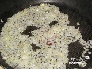 Очищаем картофель и лук от кожуры, промываем под водой. На сковороду выкладываем порезанный кубиками лук. Обжариваем его до золотистого цвета.