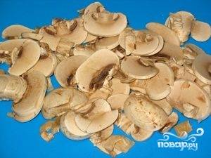 Пока картофель жарится, нарезаем наши шампиньоны крупными пластинками.