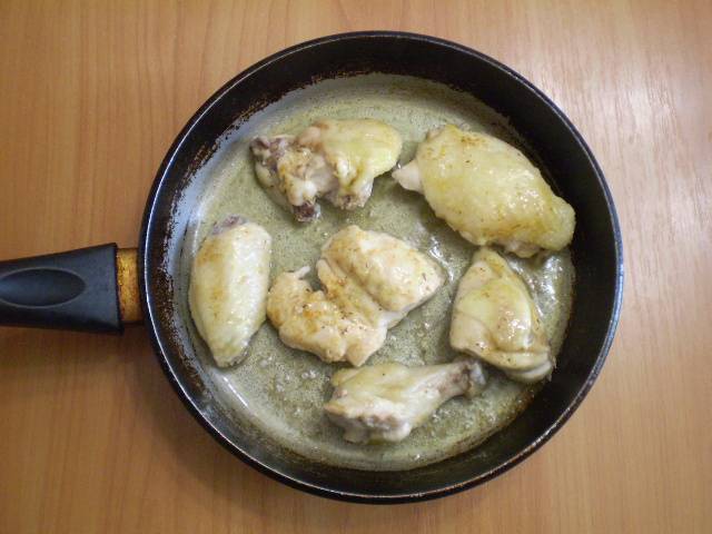 Переворачиваем, делаем меньше огонь и дожариваем под крышкой, пока мясо не приобретет красивый золотой цвет корочки. При проколе должен вытечь прозрачный сок. Курица готова, можно снимать.