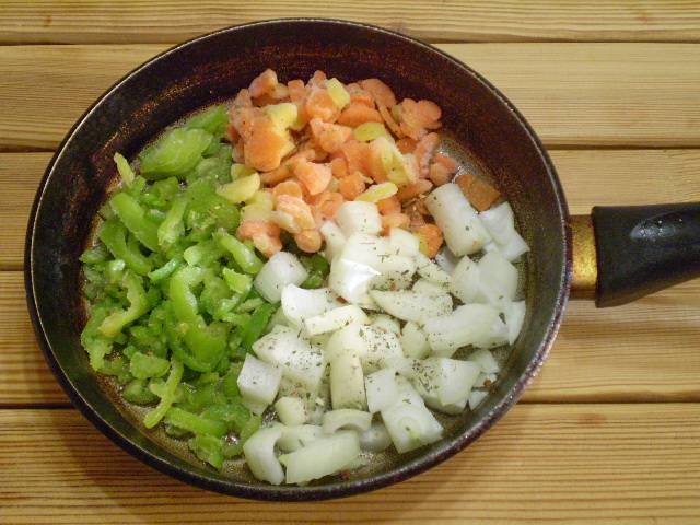 5. На другой сковороде параллельно обжарьте овощи. Посолите, добавьте специи.