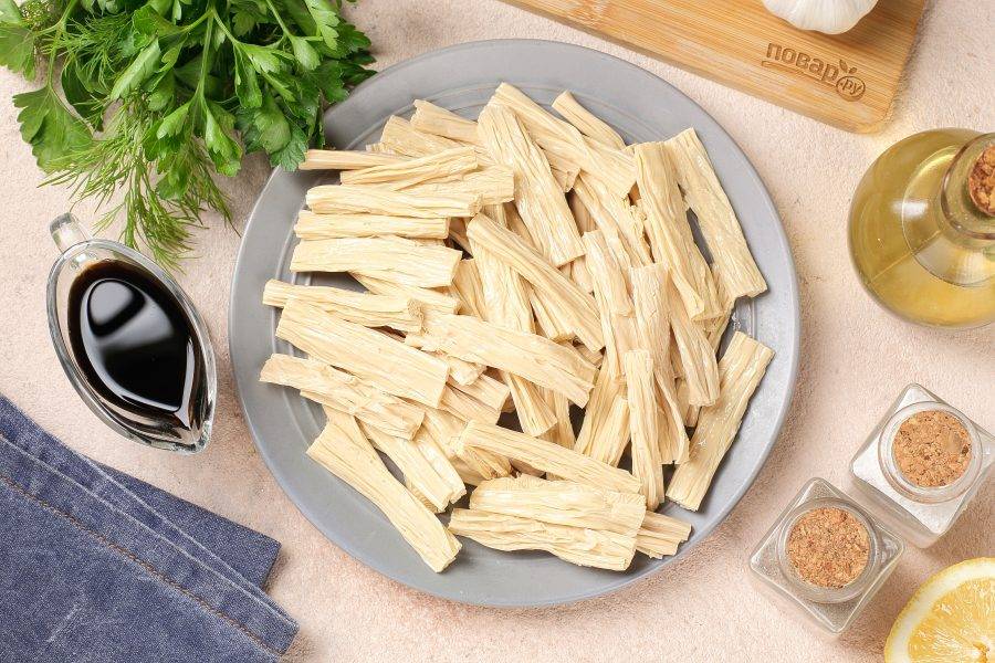 Соевую спаржу залейте холодной водой и оставьте при комнатной температуре на 12 часов.