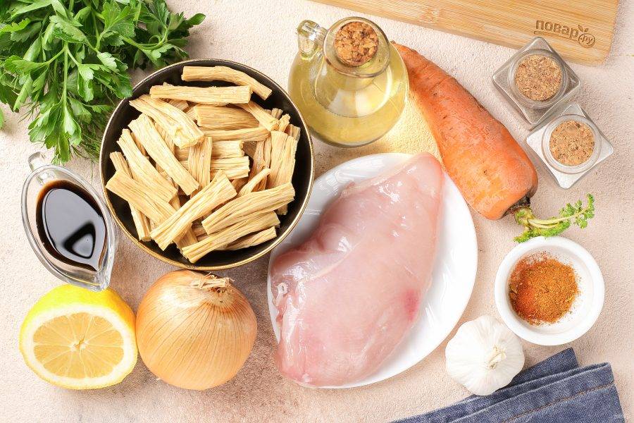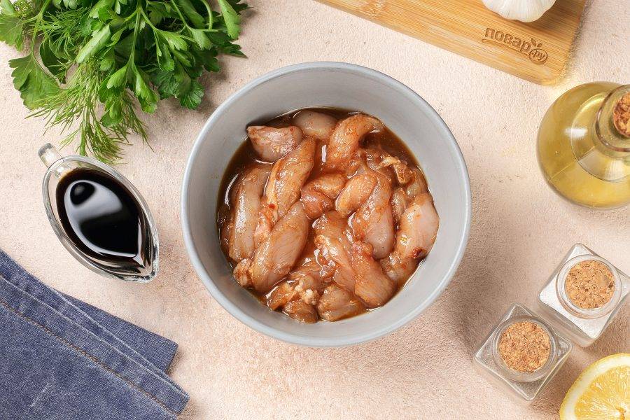 Куриную грудку нарежьте полосками, добавьте сок лимона, соевый соус и специи по вкусу. Перемешайте и оставьте мариноваться.