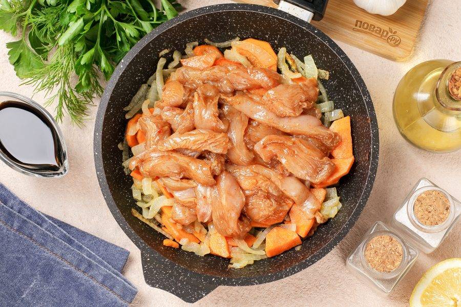 Добавьте куриное филе, стряхнув от остатков маринада.