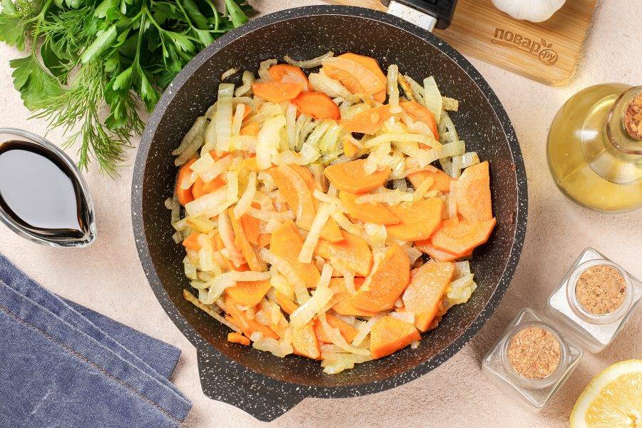 Морковь разрежьте вдоль пополам и нарежьте тонкими полукружьями, лук нарежьте перьями или полукольцами. Выложите овощи в разогретую сковороду с маслом и обжарьте до мягкости.