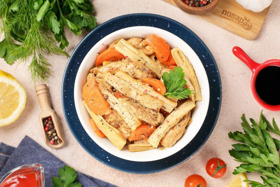 Жареная соевая спаржа с курицей готова. Подавайте в горячем виде разложив по тарелкам. Приятного аппетита!
