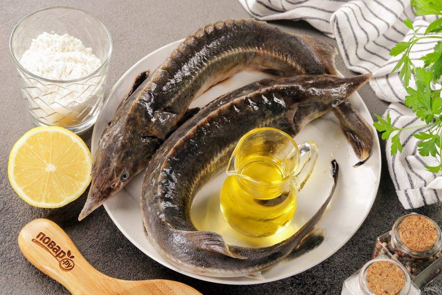 Стерлядь потрошите аккуратно, у неё хребёт "опасный" и лучше срезать его ножницами. Отрежьте голову, хвост и плавники у рыбы.