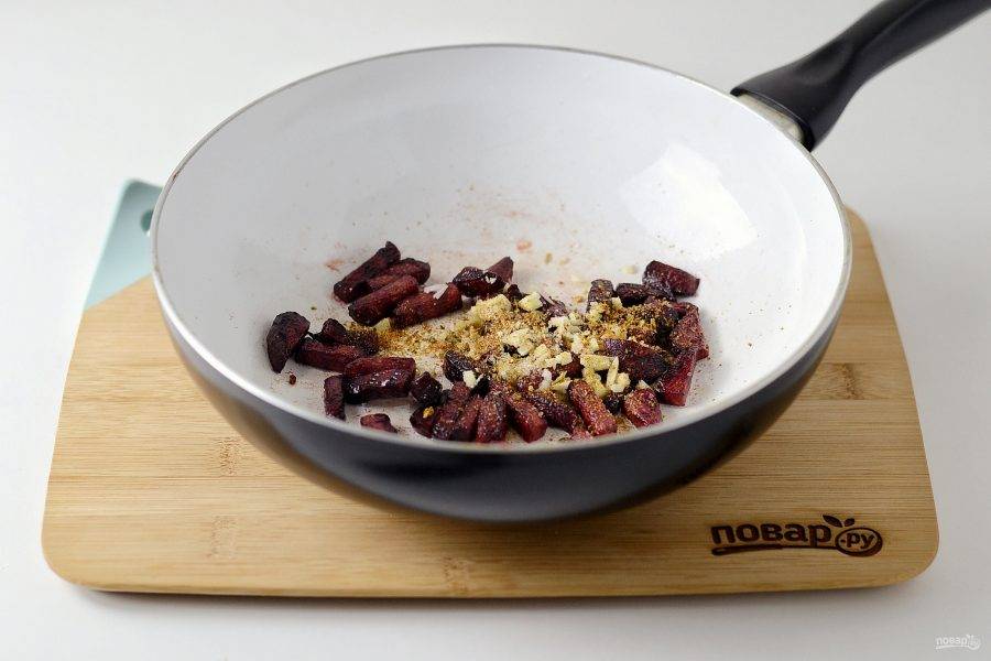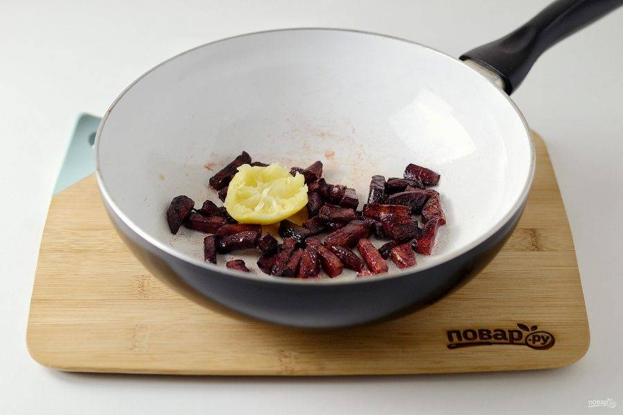 Разогрейте сковороду на средне-низком огне. Обжаривайте свеклу примерно 20-25 минут, постоянно помешивая.