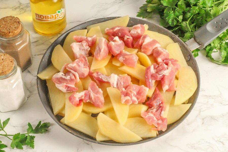 Срежьте со свинины пленки и жилы, нарежьте средними кубиками, а картофель разрежьте пополам и нарежьте слайсами.
