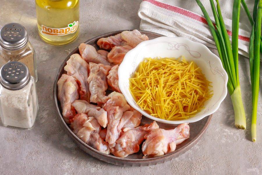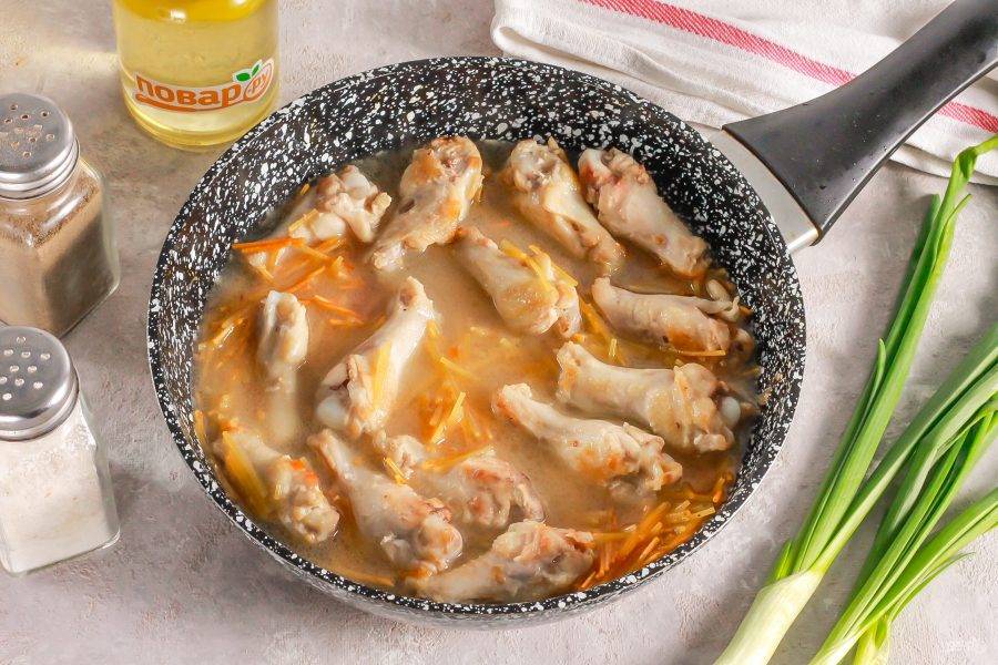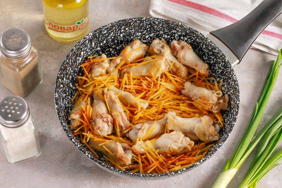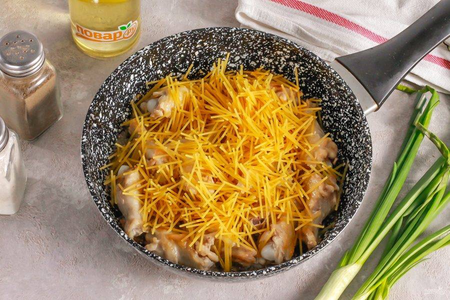Когда части курицы подрумянятся со всех сторон, всыпьте вермишель.