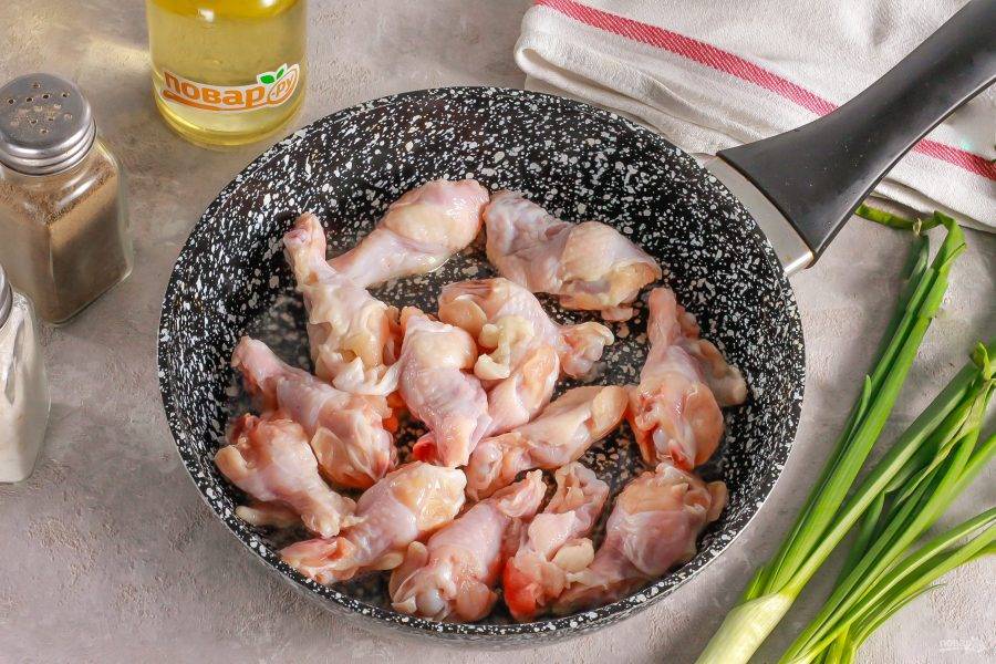 Влейте в сковороду растительное масло и выложите части курицы в емкость. Обжарьте на среднем нагреве примерно 5-6 минут, время от времени переворачивая.