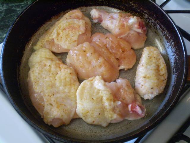 Разогрейте масло растительное на сковороде. Выкладывайте осторожно кусочки курицы и обжаривайте сначала на большом огне, для получения корочки, потом огонь уменьшите и накройте крышкой.