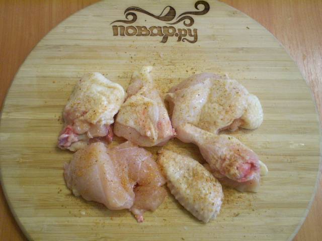Посыпьте мясо солью и специями. Оставьте на 5 минут.