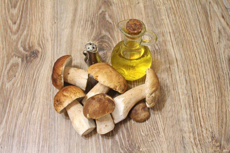 Подготовьте все необходимые ингредиенты для приготовления жареных боровиков. Грибы переберите и тщательно очистите от загрязнений. Вымойте под проточной водой, особенно от земли.