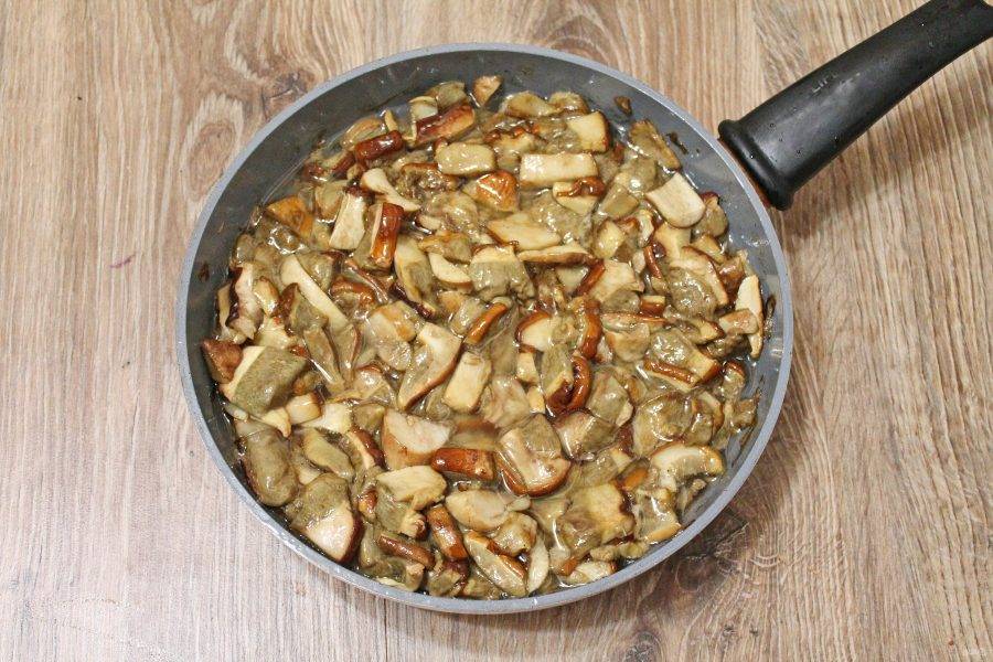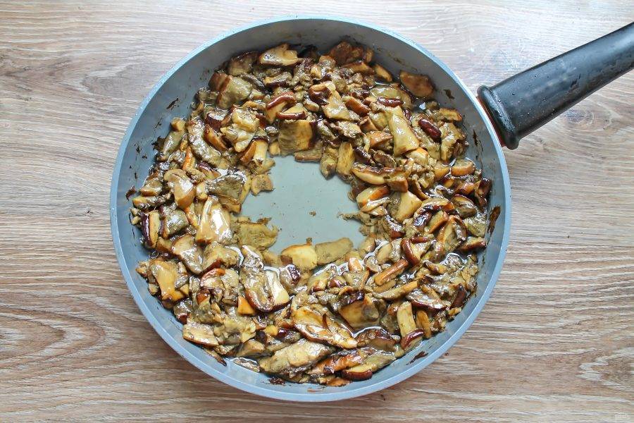 Поставьте на средний огонь, посолите и обжаривайте, перемешивая, до полного испарения жидкости.