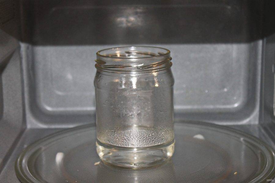 Банки и крышки тщательно вымойте пищевой содой в горячей воде. Железные крышки залейте водой и кипятите в течение 10 минут. Затем переложите на стерильную салфетку (продаются в аптеке) чтобы стекла вода. В чистые банки налейте воду высотой 2 сантиметра. Поставьте банки в микроволновую печку, включите на всю мощность. Крутите банки в течение 4 минут. Слейте воду и поставьте обратно. Нажимая по 10 секунд, не более, крутите банки до полного высыхания. Не делайте время больше, банки могут лопнуть и повредить технику.