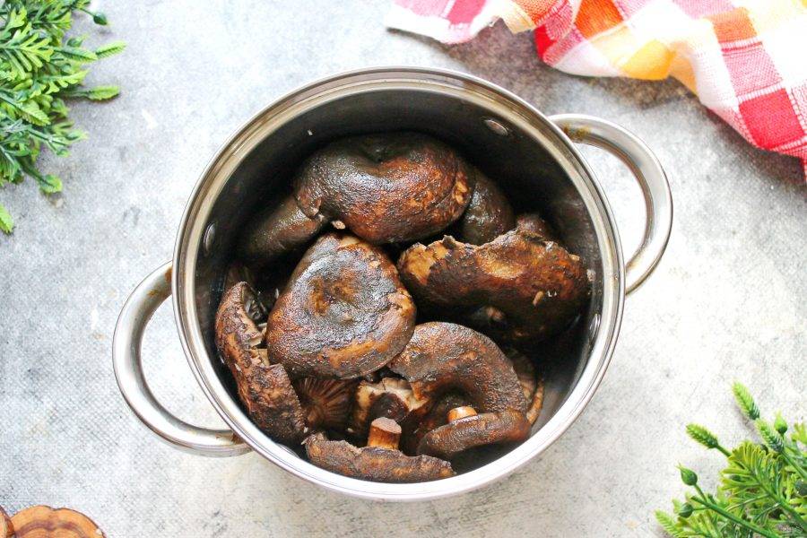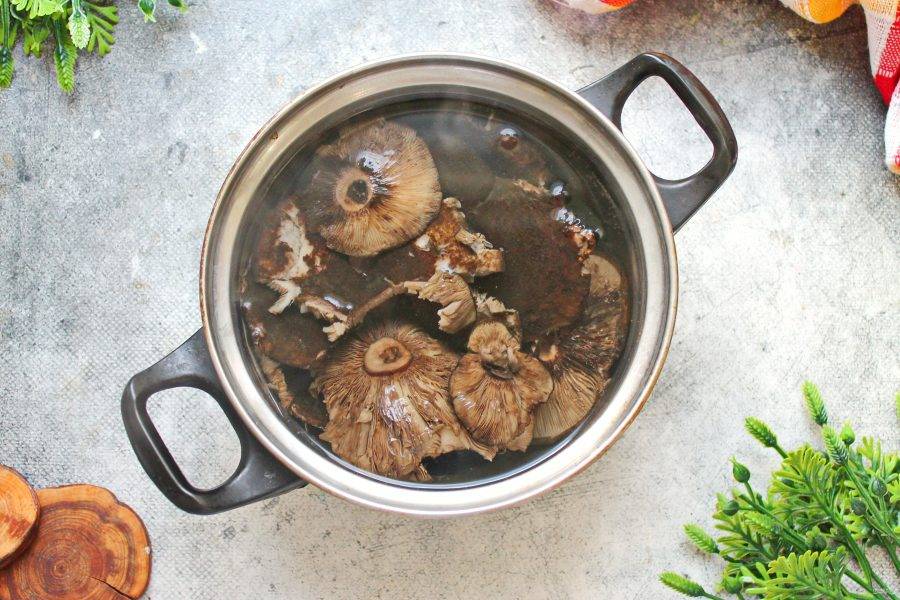 Чтобы точно удалить горечь, выложите шляпки в кастрюлю, залейте водой, немного посолите и отварите их на среднем огне в течение 10 минут. Откиньте грузди на сито и дайте жидкости полностью стечь.