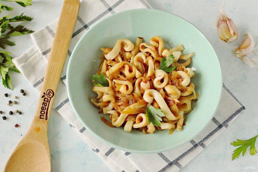 Перемешайте и готовьте еще 1-2 минуты. Жареные кальмары в соевом соусе готовы.