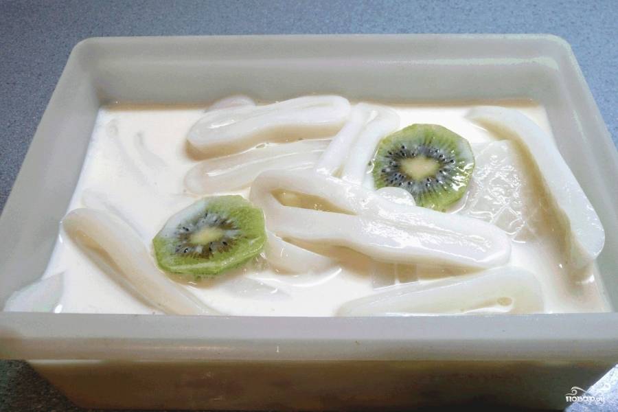 Налейте в миску молока и нарежьте туда же киви. Положите кальмары. Пусть маринуются в таком молочном маринаде. Мариновать лучше целую ночь, но если гости вот-вот нагрянут, то можно и на часик оставить:)