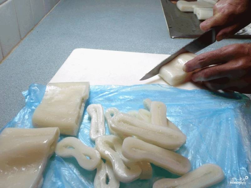 Приготовьте кальмаров. Разморозьте, если у вас были замароженные. Очистите от плёнки и нарежьте.