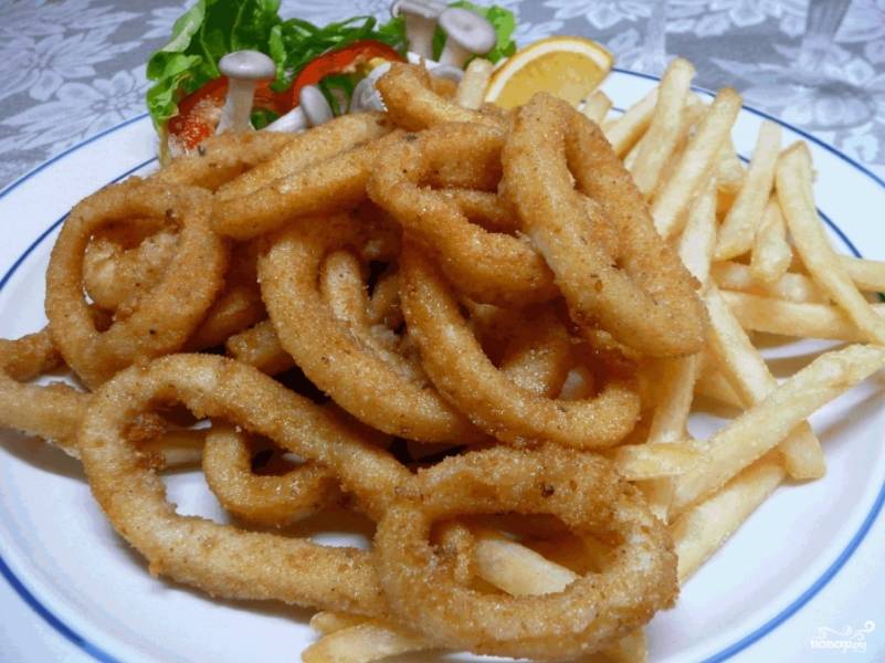 Слейте кальмаров, лучше выложить их в дуршлаг или сито. Смешайте в миске яйца и немного молока. А рядом выложите муку в тарелку, в другую - сухари. И жарьте их в такой последовательности - сначала изваляйте в муке, потом в яйце и затем в сухарях. Обжаривайте во фритюре или сковороде с раскалённым растительным маслом (много масла:)) около трёх минут. Пока не станут золотистыми.