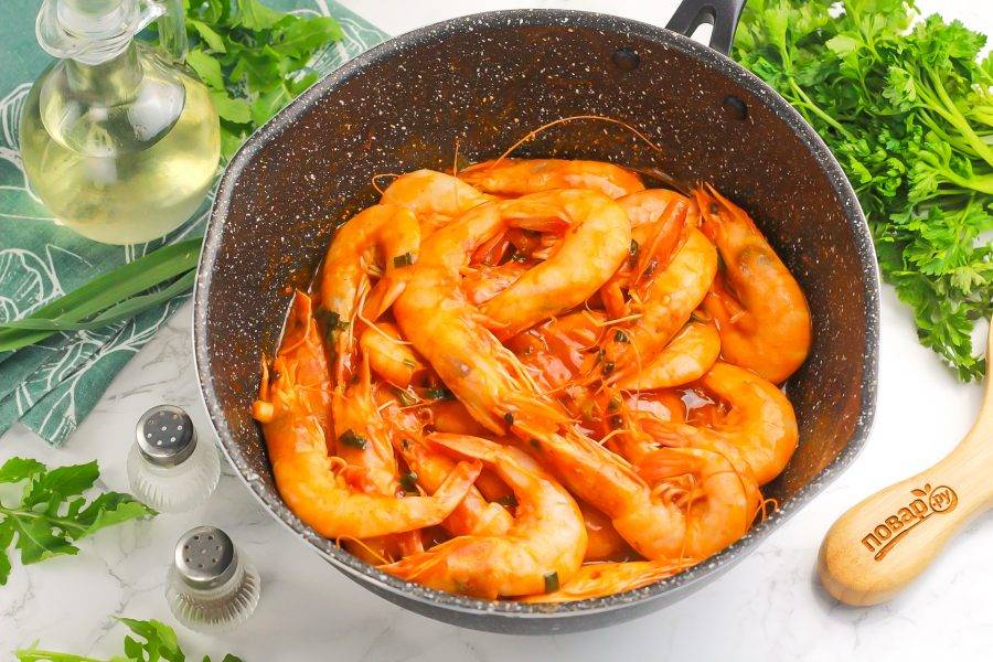 Обжаривайте креветки на среднем нагреве примерно 5-6 минут, время от времени перемешивая. Морепродукты должны отлично прожариться со всех сторон и быть покрыты получившимся соусом. По кухне поплывет неимоверный аромат — на него сбегутся все родные!