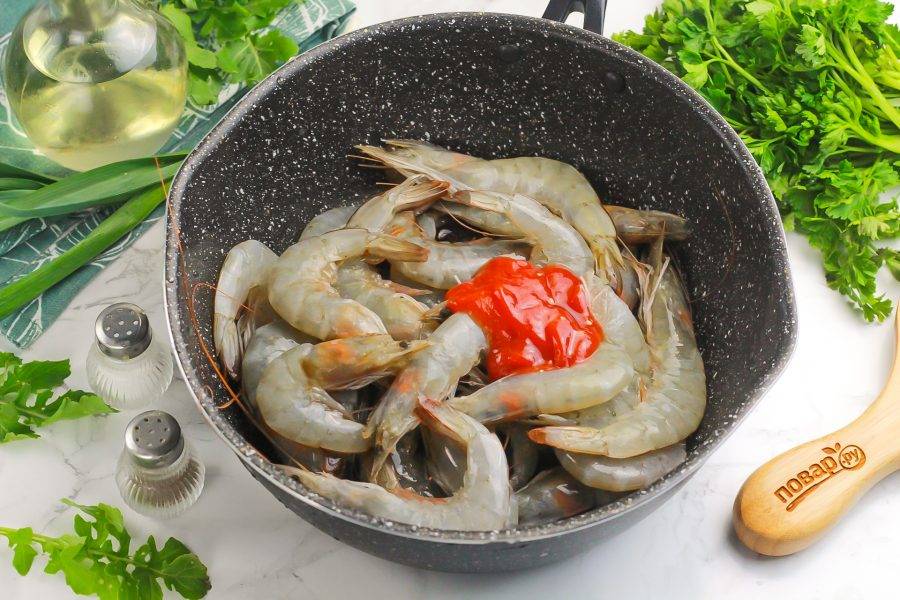 Креветки промойте в воде, удалите усы, лапки (по желанию). Если они были замороженными, то обязательно разморозьте их перед началом приготовления и слейте лишнюю жидкость. Влейте в сковороду с высокими бортиками растительное масло, прогрейте его и выложите креветки.