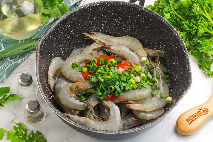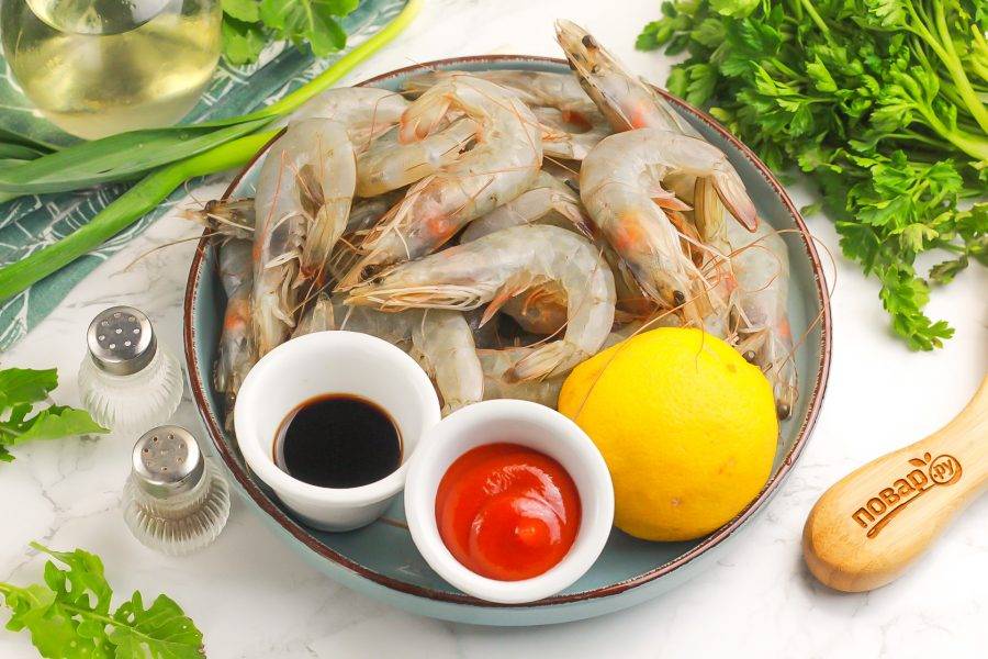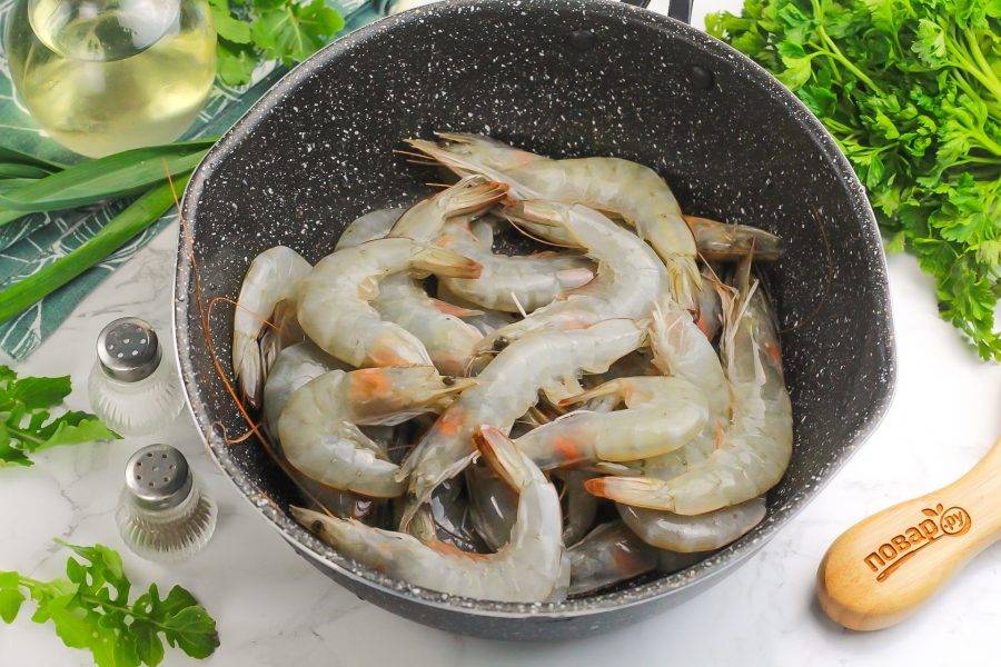 Подготовьте указанные продукты. Креветки можно приобрести замороженные или свежие. Обращайте внимание на цвет морепродуктов: серые нужно готовить около 5-6 минут, а розовые — 3-4 минуты.