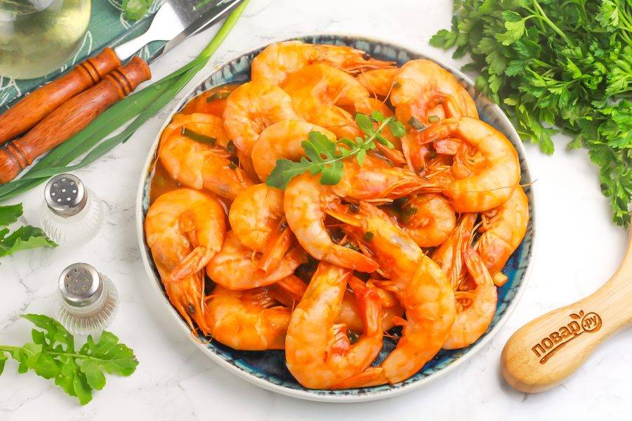 Выложите горячие креветки в томатной пасте на тарелку и подайте их к столу. Не забудьте про бокальчик холодного пива. Приятного вам аппетита!