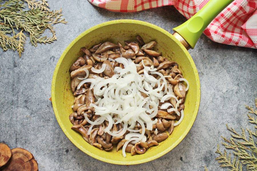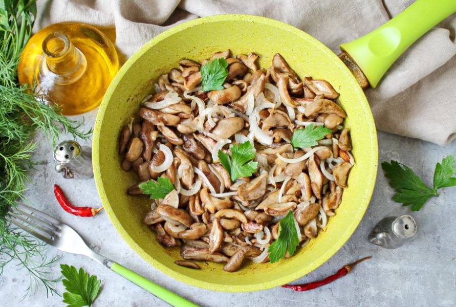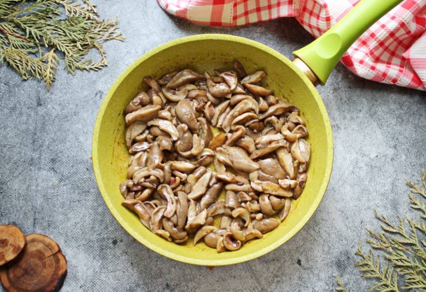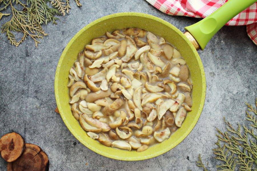 Обжаривайте грибы в течение 15 минут, перемешивая. Если будет появляться пена, удаляйте.