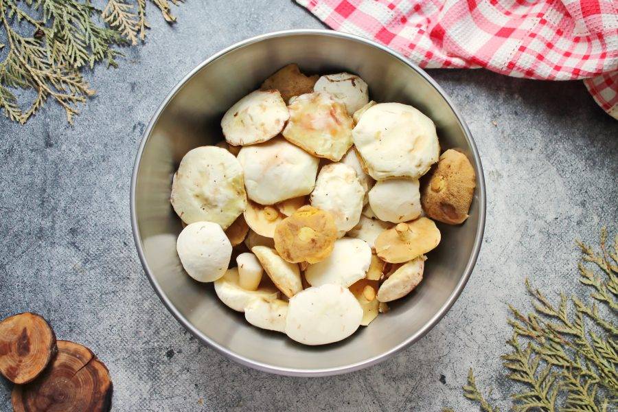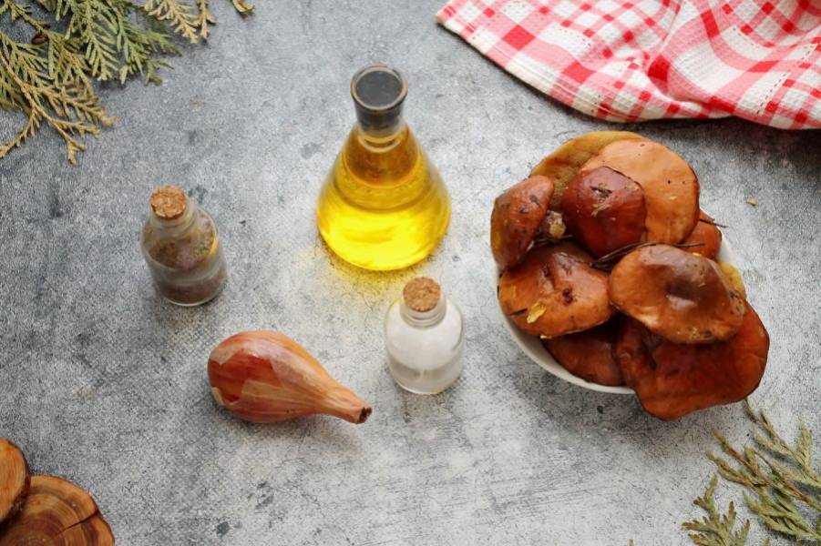 Подготовьте все необходимые ингредиенты для приготовления жареных маслят на сковороде. Грибы переберите, удаляя червивые, отрежьте загрязнения на ножках.