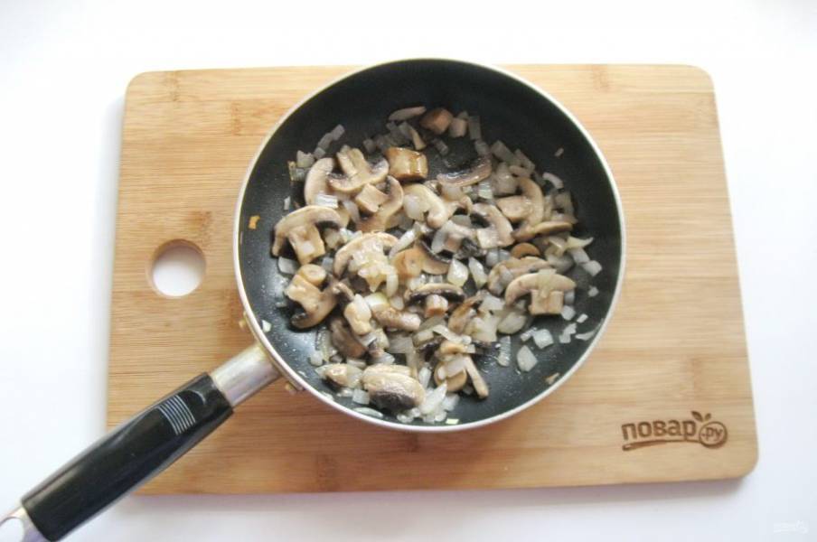 Налейте подсолнечное масло и обжаривайте лук с грибами, периодически перемешивая в течение 10 минут.