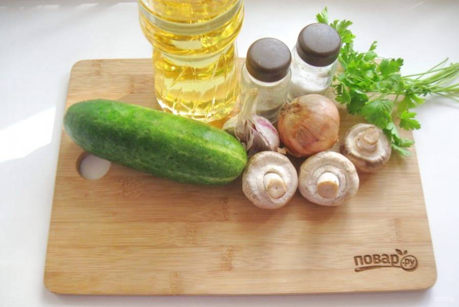 Подготовьте ингредиенты для приготовления жареного огурца с грибами.