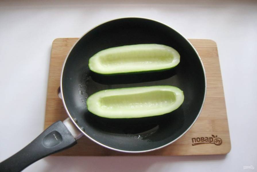 Выложите огурец в сковороду с небольшим количеством подсолнечного масла и обжарьте со всех сторон.