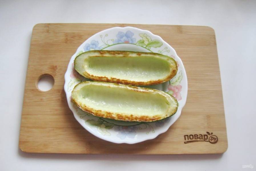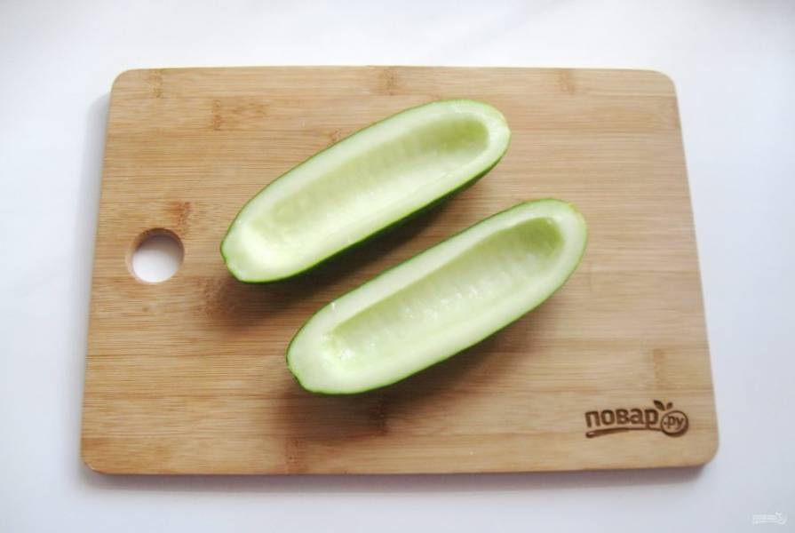Огурец помойте, высушите и разрежьте на две части вдоль. Удалите семечки чайной ложкой.