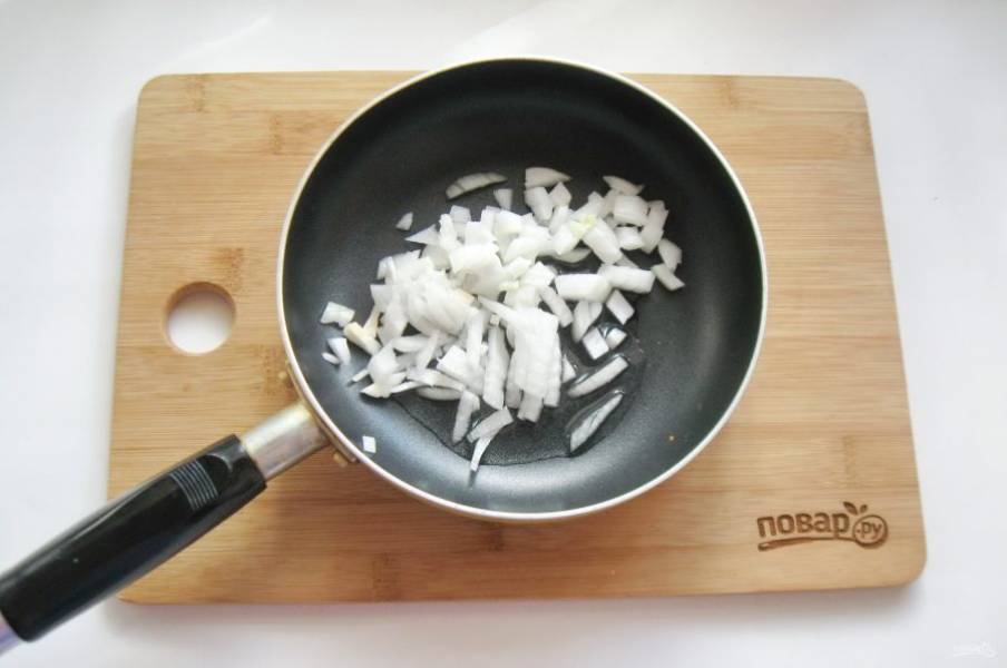 Репчатый лук очистите, помойте и нарежьте произвольно. Выложите в сковороду.