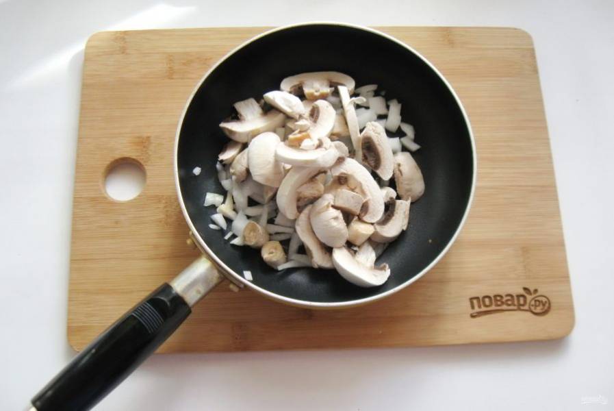 Шампиньоны очистите, помойте и нарежьте. Добавьте к луку.