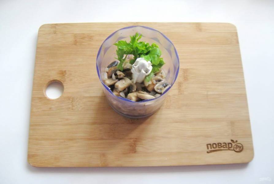 Выложите жареный лук с шампиньонами в блендер. Добавьте зубчик чеснока и петрушку.